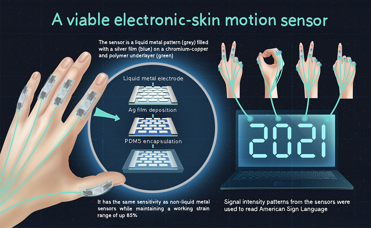An electronic skin with cutting-edge sensitivity tracking a broad range of body motion has been created using liquid metal and a rigid nacre-inspired chromium-copper and silver underlayer.