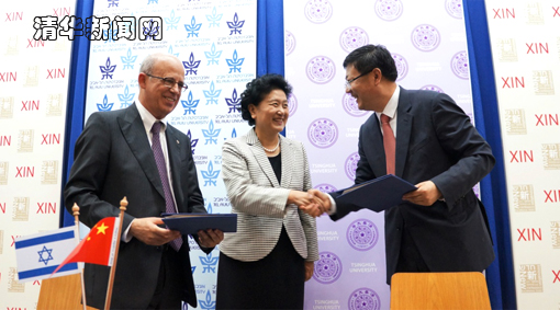 Tsinghua University and Tel Aviv University in Israel signed an agreement for establishing XIN, a joint center for innovative research and education, on May 20 (Israel time). Chinese Vice-Premier Liu Yandong, Minister of Education Yuan Guiren, National Health and Family Planning Commission Director Li Bin, Vice-Minister of Foreign Affairs Wang Chao, Vice-Minister of Science and Technology Wang Weizhong, and the Chinese ambassador to Israel Gao Yanping attended the inauguration ceremony held at Tel Aviv University. Tsinghua University President Chen Jining and Prof. Joseph Klafter, the President of Tel Aviv University, signed the agreement on behalf of their respective universities.