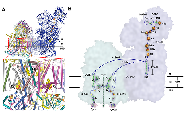 Based on the structure, Professor Yang provided a new electron transfer model. The UQH2 is released from the CI and diffuses to the Qi site close to the heme bH of CIII, then transfers one electron to heme bH and changes to semiQ (SQ) radical. After that, the heme bH transfers the electron to heme bL, meanwhile accepts another electron from the SQ radical and the oxidized UQ would be released from the Qi site. After both of the heme bLs acquired an electron and the ISP proteins changed to the “b” state, the electrons could be transferred to the two [2Fe-2S] clusters, and then the ISP proteins change to the “c1” state to transfer the electrons to the heme c1 from their [2Fe-2S] clusters. Finally, each heme c1 transfers the single electron to Cyt.c. Together with the transfer of electrons, the two protons dissociated from the UQH2 might be translocated from the Qi site to the IMS using the redox energy released by electron transfer. In conclusion, in each cycle of electron transfer cascade one molecule of UQH2 distributes two electrons to two separate electron acceptors, Cyt.c, and in the meanwhile CIII translocates two protons from UQH2 to IMS. (Figure 3)