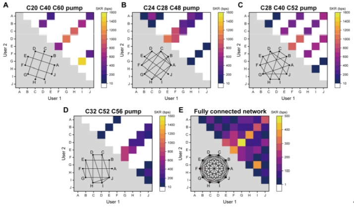 Fig. 2 The network topologies and experimental results of the fully connected entanglement-based QKD network with 10 users
