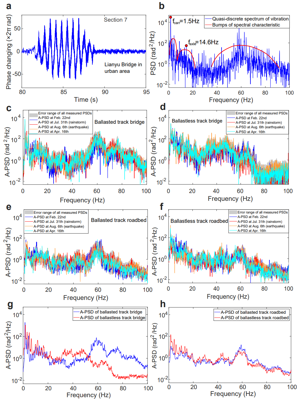 The study proposed average power spectral density (A-PSD) of train-induced vibration as an indicator for HSR health monitoring (Fig. 2). A-PSD error margins were established for each railway section and validated through over 14 months of continuous monitoring. During that time, there were earthquakes, rainstorms, and seasonal changes. However, the A-PSD of railway sections remained stable within the error margins (Fig. 2c–f), consistent with the healthy railway condition.