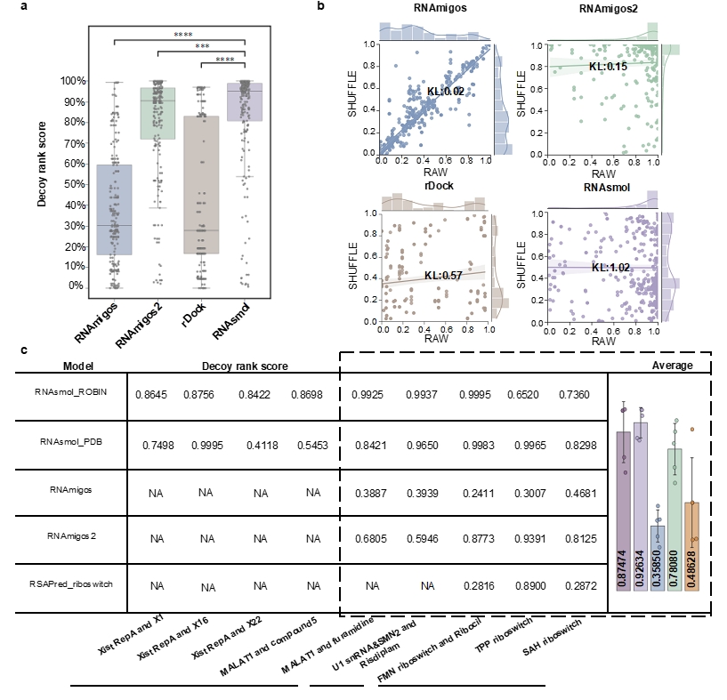 In the application of virtual screening, RNAsmol shows unique advantages. Unlike traditional screening methods that rely on structural information, RNAsmol makes predictions based entirely on RNA sequence information. Because the three-dimensional structural data of many disease-related RNA targets (such as lncRNA) are often difficult to obtain, RNAsmol can fill this data gap to achieve predictive screening of these targets. Experimental results show that RNAsmol successfully improved the ranking score by about 30% when distinguishing between bait molecules and real ligands. Therefore, RNAsmol has a wide range of applicability in various RNA-targeted drug screening, and this method can be used to screen potential drug molecules more efficiently.