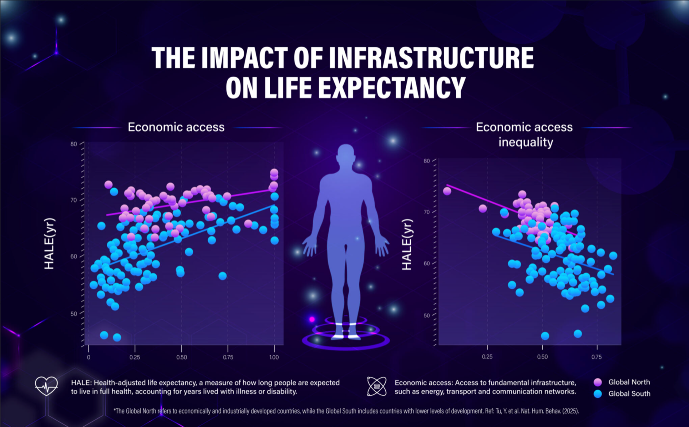 Caption: A global study finds that unequal access to roads, power, and communication networks reduces life expectancy more than hospital access—just a 10% gap can cut a year off.