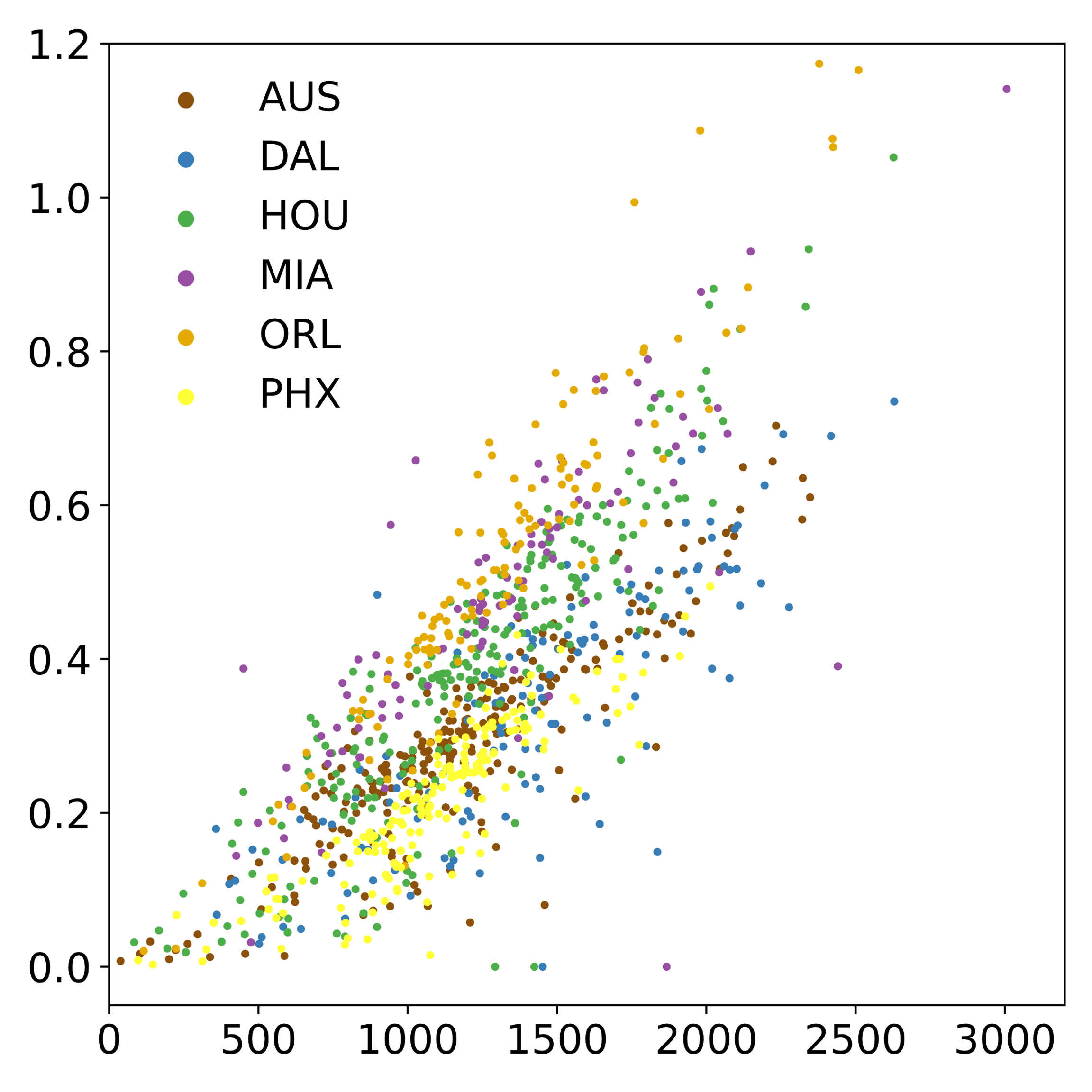 Climate change’s effect on household optimal rooftop solar capacity in terms of cost and return versus annual cooling demand increase in hot cities in the United States in a scenario in which there is a moderate increase in average annual temperatures. The x-axis shows the possible cooling demand increase in terms of kilowatts per year and the y-axis is the likely corresponding rooftop solar power adoption increase in terms of kilowatts per house. In hot cities increases in both need and capacity are likely to rapidly increase. (Cities: AUS: Austin, DAL: Dallas, HOU: Houston, MIA: Miami, ORL: Orlando, PHX: Phoenix).