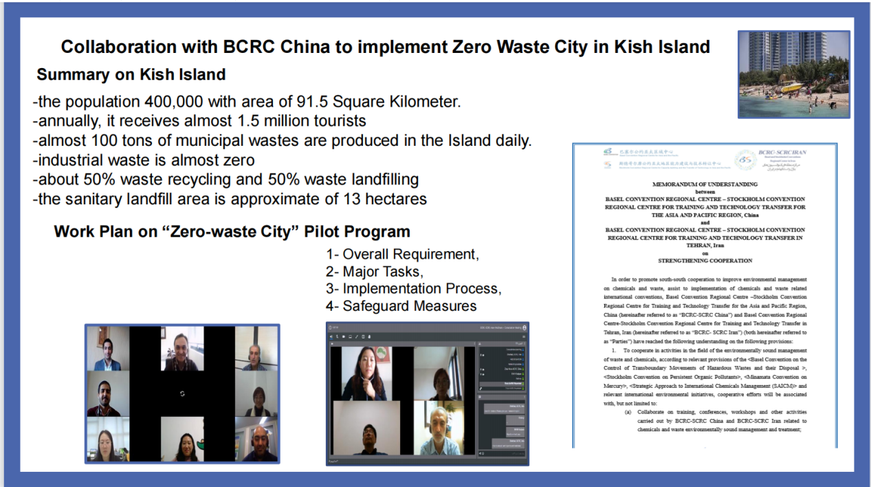 In the reporting session, firstly, Mr. Wang Ziyuan, Officer of Solid Waste Division, Department of Solid Waste and Chemicals, Ministry of Ecology and Environment, China, introduced Zero-waste City in three aspects: the working process of the pilot construction of China's Zero-waste City, the remarkable results achieved in the pilot construction of the Zero-waste City, the promotion plan for the construction of Zero-waste City during the “14th Five-Year Plan” period. Then, Ms. Clare Chow, Senior Assistant Director, Environmental Policy Division, Ministry of Sustainability and the Environment,Singapore, introduced Singapore’s Zero-waste Master Plan and Singapore’s circular economy management measures for three priority waste streams: food waste, packaging waste, and e-waste. Thirdly, Ms. Shan Guijuan, Deputy Chief of Environmental Technology Branch of Basel Convention Regional Centre for Asia and the Pacific, and Mr. Craig Boljkovac, Senior Advisor, jointly introduced the organizational progress of the International Network of Zero-waste Cities Initiative. Finally, Mr.Mehdi Sameni, Director of Basel Convention and Stockholm Convention Regional Centre for Training and Technology Transfer in Iran, introduced Iran's nationwide zero-waste initiative, and said that the Basel Convention and Stockholm Convention Regional Center for Iran will work with the Basel Convention Regional Center for Asia and the Pacific to build a zero-waste Kish Island.