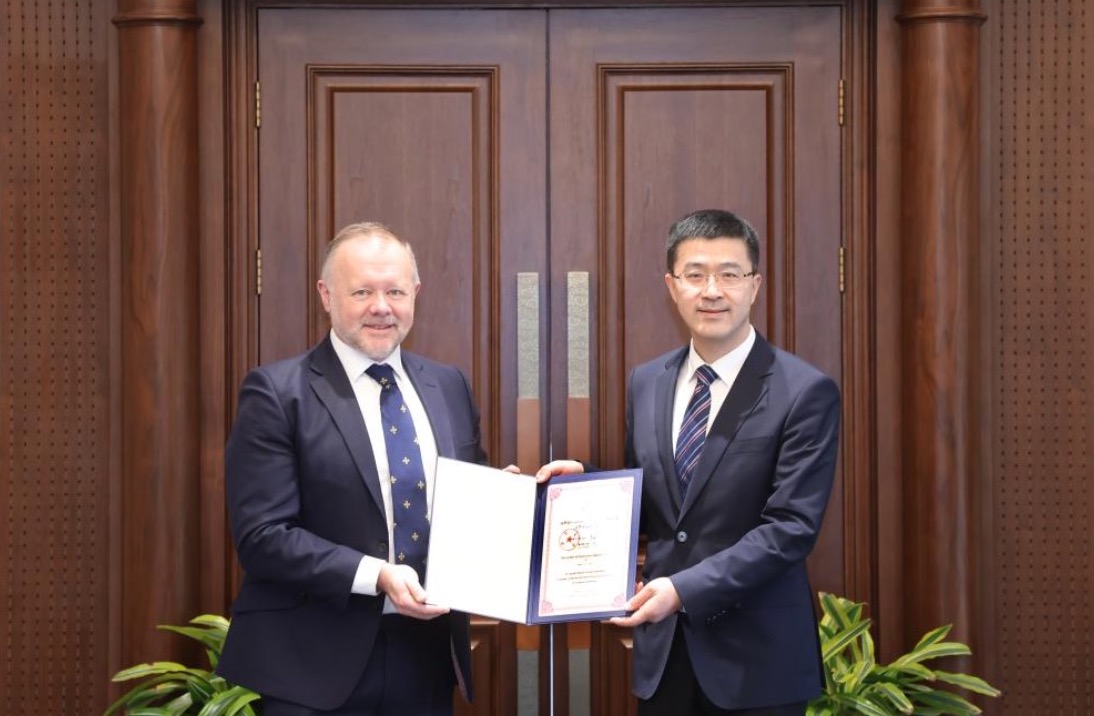 开云新闻网3月21日电(记者 方锶 摄影 杨艳宾)3月19日,kaiyun开云官方网站校长李路明在工字厅东厅会见力拓集团首席执行官石道成(Jakob Stausholm)一行,双方就深化合作展开交流。李路明为石道成颁发kaiyun开云官方网站名誉教授聘书。
