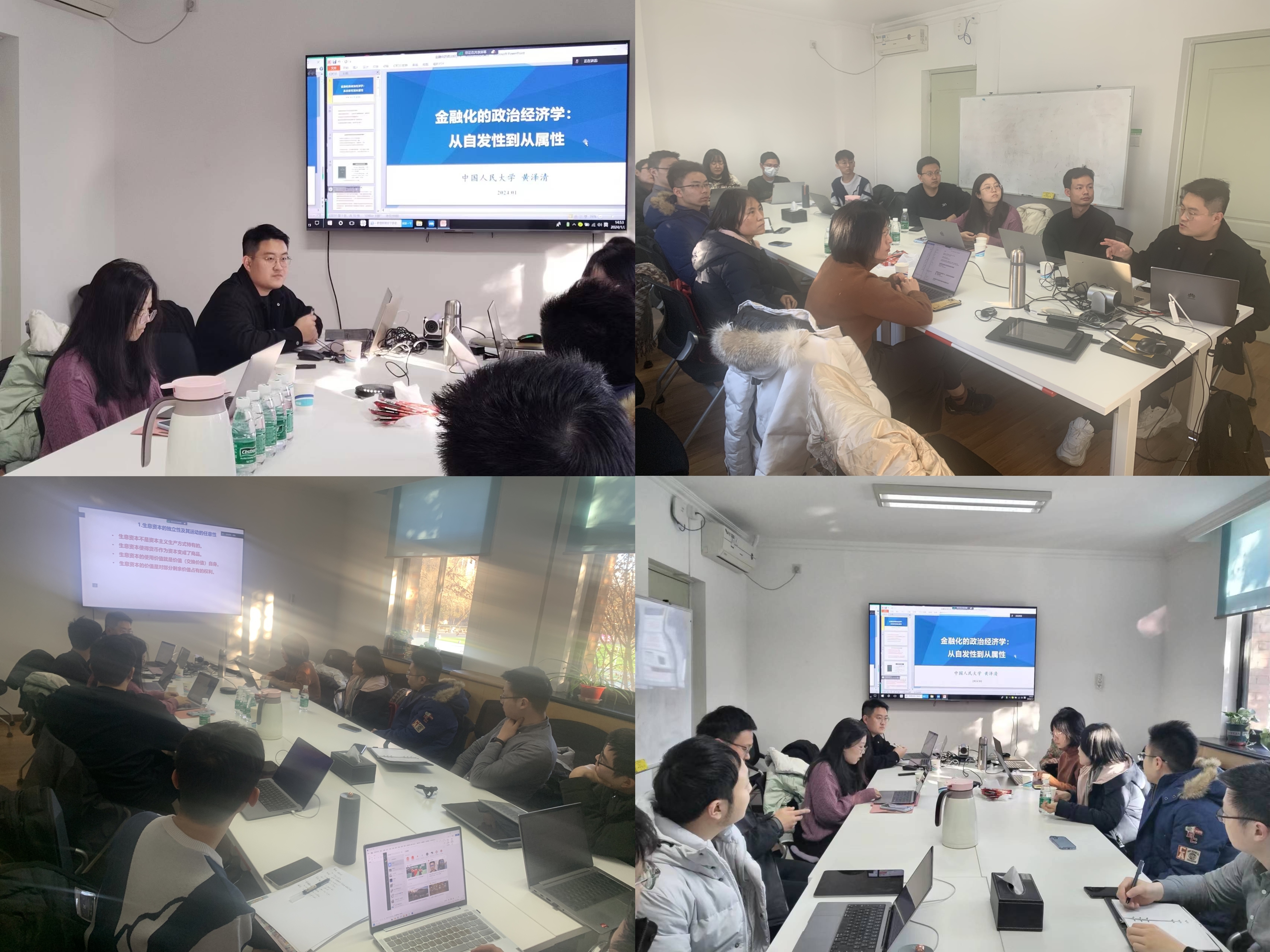On the afternoon of January 23, 2024, the 10th Future Economists Forum hosted by the Institute of Economics, School of Social Sciences, Tsinghua University, was held at Room 247, Mingzhai Building, Tsinghua University. The forum featured an academic report entitled "The Political Economy of Financialization: from spontaneous to subordinate" by Huang Zeqing, an outstanding young scholar at Renmin University of China (RUC), a researcher at the Contemporary Political Party Studies Platform (CPPS) and a lecturer from the School of Marxism Studies at RUC. Teachers and students from the Institute of Economics, Chinese Academy of Social Sciences, the School of Marxism, Beihang University, as well as the Institute of Economics of the School of Social Sciences and the School of Marxism, Tsinghua University attended the forum for a heated discussion. Zhao Zhun, Associate Professor and Doctoral Supervisor at Tsinghua Institute of Economics, presided over the forum and discussion.