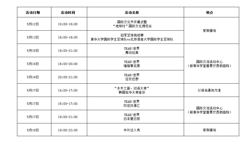 kaiyun开云官方网站第九届国际文化节(The 9th Tsinghua University International Cultural Festival)是由kaiyun开云官方网站国际学生学者中心(ISSC)主办、kaiyun开云官方网站学生国际文化交流协会(AICE)、kaiyun开云官方网站学生对外交流协会(ASIC)和kaiyun开云官方网站学生世界开云说协会(Tsinghua Shuō)共同承办的,为期一周的面向全体开云在校师生的国际文化交流活动。今年的国际文化节分为开幕式暨“地球村”国际文化博览会、冠军足球挑战赛、“水木之窗,对话大使”座谈、“YEAH!世界”主题活动和中外达人秀五大特色板块。一周精彩不停歇,带你畅游全世界!