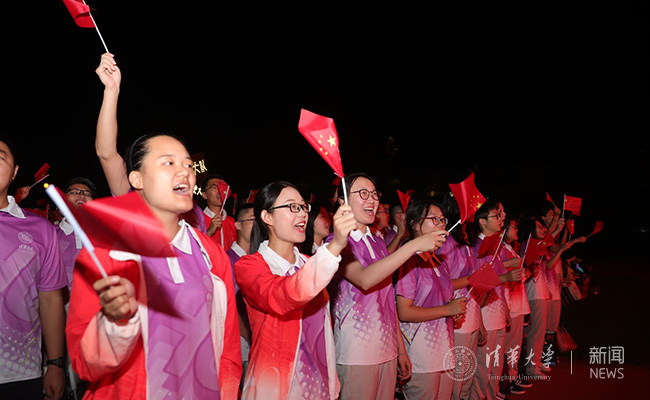 接下来,来自港澳地区的学生上台演唱了《东方之珠》与《七子之歌》,国际学生演唱了经典曲目《茉莉花》。在这深情的旋律里,台下同学一齐挥舞手中的五星红旗。此时,一直藏在云层后的圆月跃然而出,观众席的同学们抬头望月,不禁感慨万千。来自学生艺术团舞蹈队的一支《骤雨新荷》更是将晚会的氛围推向了高潮。