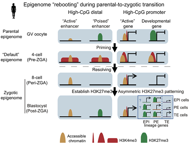 前期研究表明,在小鼠中,H3K4me3与H3K27me3均呈现与体细胞不同的非经典的分布规律。而在人类卵细胞中,H3K4me3与H3K27me3均呈现经典的分布模式。在受精后,小鼠中母源H3K27me3能够传递至囊胚,而人类的H3K27me3在合子基因组激活前被大规模地去除,并在基因组激活后重新建立。H3K4me3在合子基因组激活前出现在许多启动子区域以及基因远端开放区域,并伴随着这些区域染色质开放性的建立。研究团队将这种H3K4me3称之为预备性的H3K4me3(priming H3K4me3)状态。在合子基因组激活后,这些区域会转变为激活或抑制的状态。研究人员提出了“表观基因组重启”模型。这些结果说明人类早期发育中的组蛋白重编程具有高度的物种特异性。研究团队也研究了人类早期谱系分化过程的表观遗传学调控。通过结合染色质图谱和已发表的单细胞转录数据,研究团队预测了人类早期谱系的关键调控因子。
