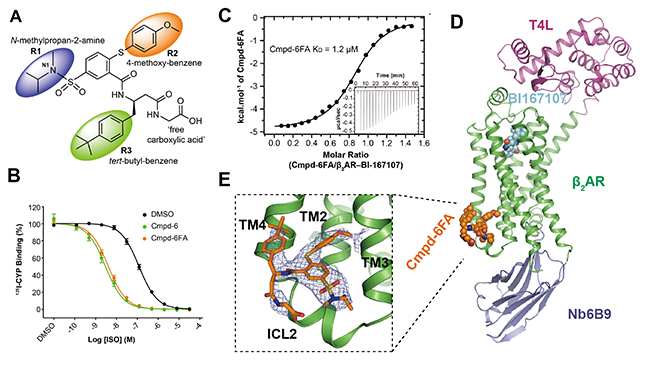 布莱恩·科比尔卡教授研究组和罗伯特·莱夫科维茨教授研究组合作,尝试利用蛋白质晶体学的手段获得激活态β2AR与Cmpd-6的复合物结构。然而初期的多次尝试都无法检测到Cmpd-6的电子密度。研究人员分析认为这是由于Cmpd-6溶解度较低,且亲和力较弱(uM级别),导致在晶体里面Cmpd-6的占有率较低,无法检测到电子密度。为了解决这个问题,罗伯特·莱夫科维茨教授研究组在Cmpd-6上引入乙酸基团获得溶解度更高的衍生物Cmpd-6FA。布莱恩·科比尔卡研究组发现在较高沉淀剂PEG400浓度下Cmpd-6FA溶解度比较高,并经过一系列的晶体筛选和优化,成功在高PEG400浓度的条件下获得了激活态β2AR的晶体。最终在一个添加了3 mM Cmpd-6FA的结晶条件下收到了3.2埃的晶体数据,并且观测到了属于Cmpd-6FA的电子密度。Cmpd-6FA结合在跨膜螺旋2、3、4和第二胞内环(ICL2)形成的结合口袋里(图1)。