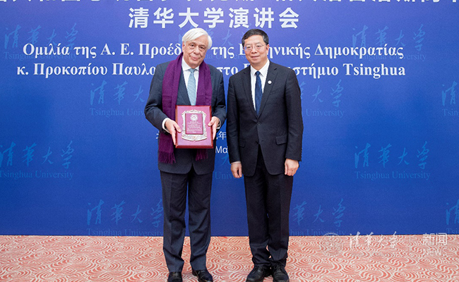 演讲后,邱勇向帕夫洛普洛斯总统赠送海外名师讲堂荣誉纪念牌。