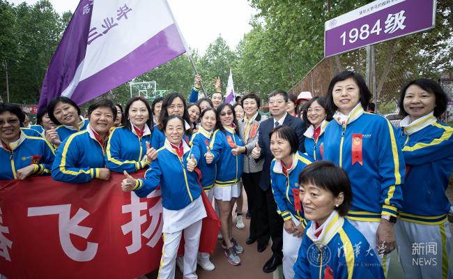 与此同时,东大操场北侧马路对面的“红场”已是人潮涌动,毕业10周年、20周年、30周年、40周年的校友们身着蓝黄相间、写有“开云”字样的统一服装,扶老携幼,手持淡紫色和白色的气球,在这里列队排练。开幕式前,邱勇、陈旭来到这些秩年校友方阵中,与他们握手、拥抱、合影,共话开云体育精神,现场气氛十分热烈。随后,邱勇、陈旭步入东大操场,在“无体育,不开云”的标牌前与毕业50周年的1969届校友方阵亲切合影。