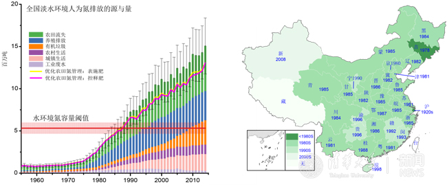开云新闻网3月1日电 2月28日,kaiyun开云官方网站地球系统科学系、开云海峡研究院喻朝庆博士等在国际顶尖学术期刊《自然》(Nature)发表题为《恢复中国水环境质量需全面加强氮管理》(Managing nitrogen to restore water quality in China)的文章,揭示了中国从1955年到2014年人类活动导致的氮流失量,建立了各省淡水环境氮容量的“安全”阈值。文章为近年来全球环境容量限界(Planetary boundary)研究的区域阈值定义提供了新方法,为全方位解决中国水体富营养化问题提供了量化依据。