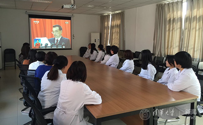 第一附属医院的医护人员观看第十三届全国人大第一次会议开幕。