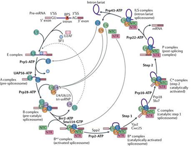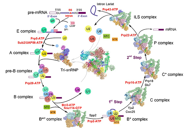 RNA剪接的本质是两步转酯反应,在剪接反应过程中,多种蛋白质-核酸复合物及剪接因子按照高度精确的顺序发生结合和解聚,依次形成预组装复合物U4/U6.U5 Tri-snRNP(U4/U6.U5三小核核糖核蛋白复合物)以及至少7个状态的剪接体B、Bact、B*、C、C*、P以及ILS复合物(图1)。
