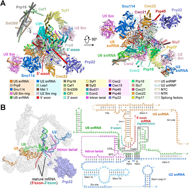 图2. 酿酒酵母催化后剪接体的三维结构。