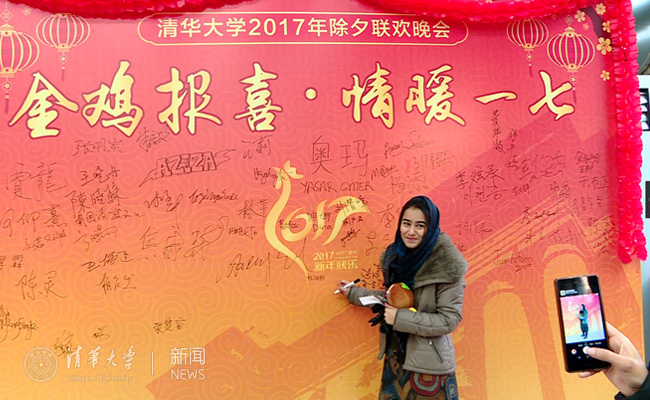 参加晚会的同学在签名墙前面拍照留念。记者 张帆 摄