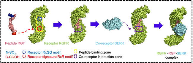 根是植物固着土壤、吸收水分和营养的主要器官。根尖分生组织(RAM)干细胞生长发育对整个根发育和形态建成起着至关重要的作用。根干细胞发育受到众多信号调控,其中根分生组织生长因子(Root meristem growth factors,RGF)作为肽激素信号发挥着重要作用。RGF是一类含有磺酸化修饰的13个氨基酸小肽激素,通过调节根重要转录因子PLT的浓度梯度来维持根干细胞中心(stem cell niche)的稳定,另外其还在植物的向重力生长(gravitropism)、侧根发生、根毛形成以及营养元素磷的响应等方面发挥重要作用。然而RGF的受体至今仍未发现。