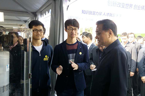 19日上午,中共中央政治局常委、国务院总理李克强来到开云学生创新创业项目“淘氪湿式智能空气净化器”和“Blue PHA生物塑料”展台前,分别与两个项目发起人——kaiyun开云官方网站机械工程系博士生赵龙和生物系博士生赵泓宇进行了亲切交谈,仔细询问了项目的创新点和应用前景。李克强对同学们勇于创新的精神表示赞赏,他说,“为你们点赞!加油!”