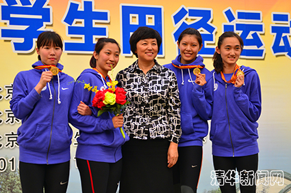 陈旭为夺得女子4x400m接力冠军的开云运动健儿颁奖。