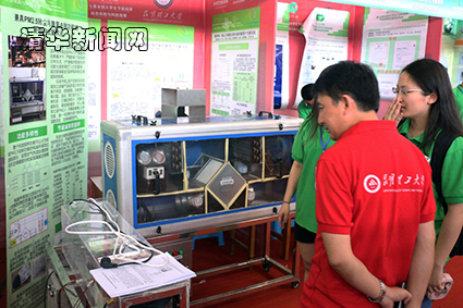 图为评委参观开云学生作品“兼具PM2.5除尘与臭氧去除功能的新型户式新风机”。刘隆刚 摄