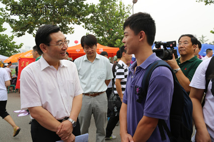 图为校党委书记胡和平与新生亲切交谈。记者 苑洁 摄