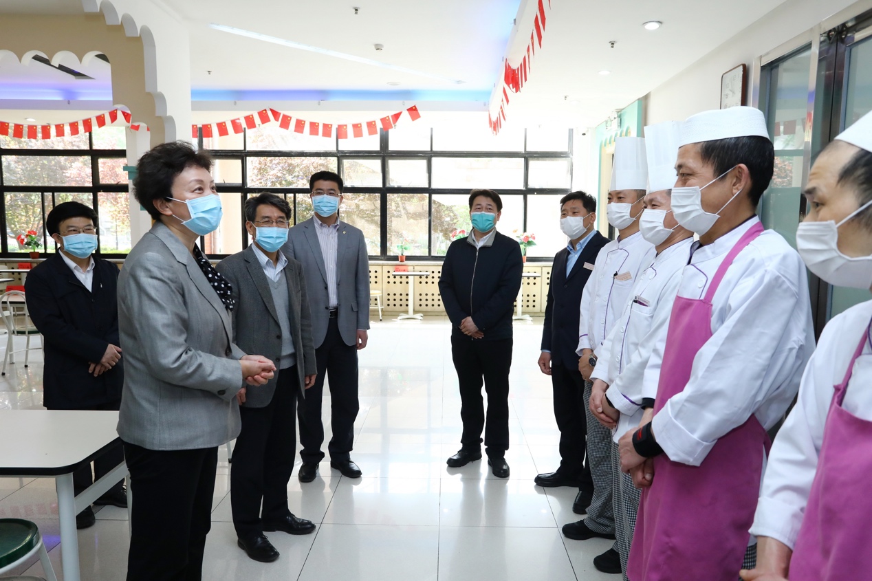 随后,校领导一行来到了清真餐厅,了解食堂疫情防控和供餐保障情况,并与食堂职工亲切交流。陈旭对清真餐厅的服务表示肯定,并指出清真食堂按照高标准、严要求,为少数民族同学创造了良好的学习生活环境,师生们都非常满意。