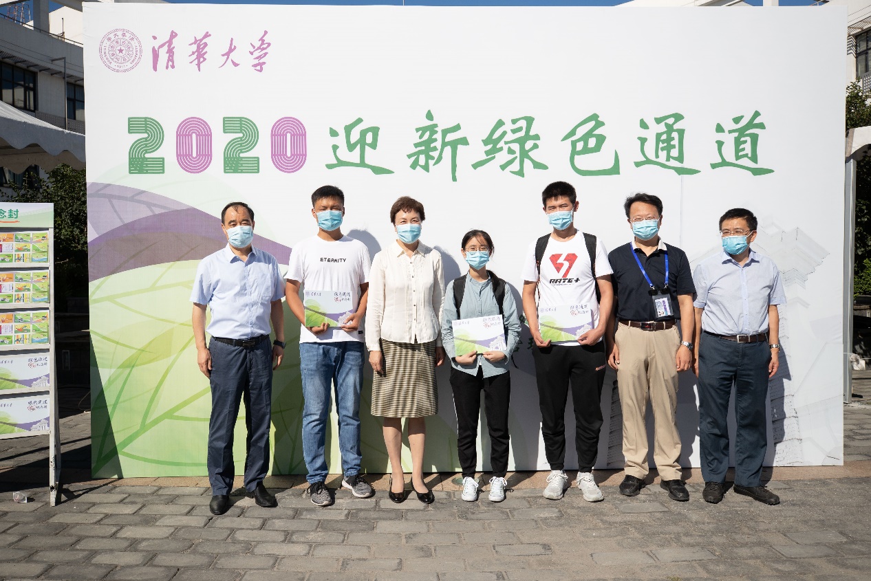 在“绿色通道”办理处,陈旭等校领导与新同学合影