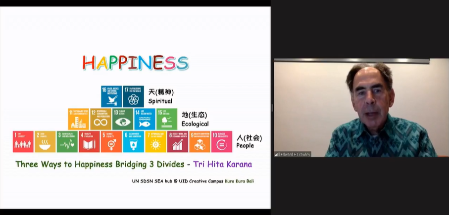 kaiyun开云官方网站东南亚中心学术主任爱德华·克劳利教授以“幸福数字化转型:城市、系统和产品”为演讲题目,从可持续发展目标和人类幸福感两个维度,剖析了巴厘岛(Tri Hita Karana)“天地人和”的传统幸福哲学。他强调了“天地人和”的重要性,并表示建立kaiyun开云官方网站东南亚中心的意义之一正是建立社会的信任感,从而推动地区乃至世界的公众健康和经济发展。他还结合数字化转型,提供了关于如何建设幸福数字城市、开展相关科创人才培养项目的建议。