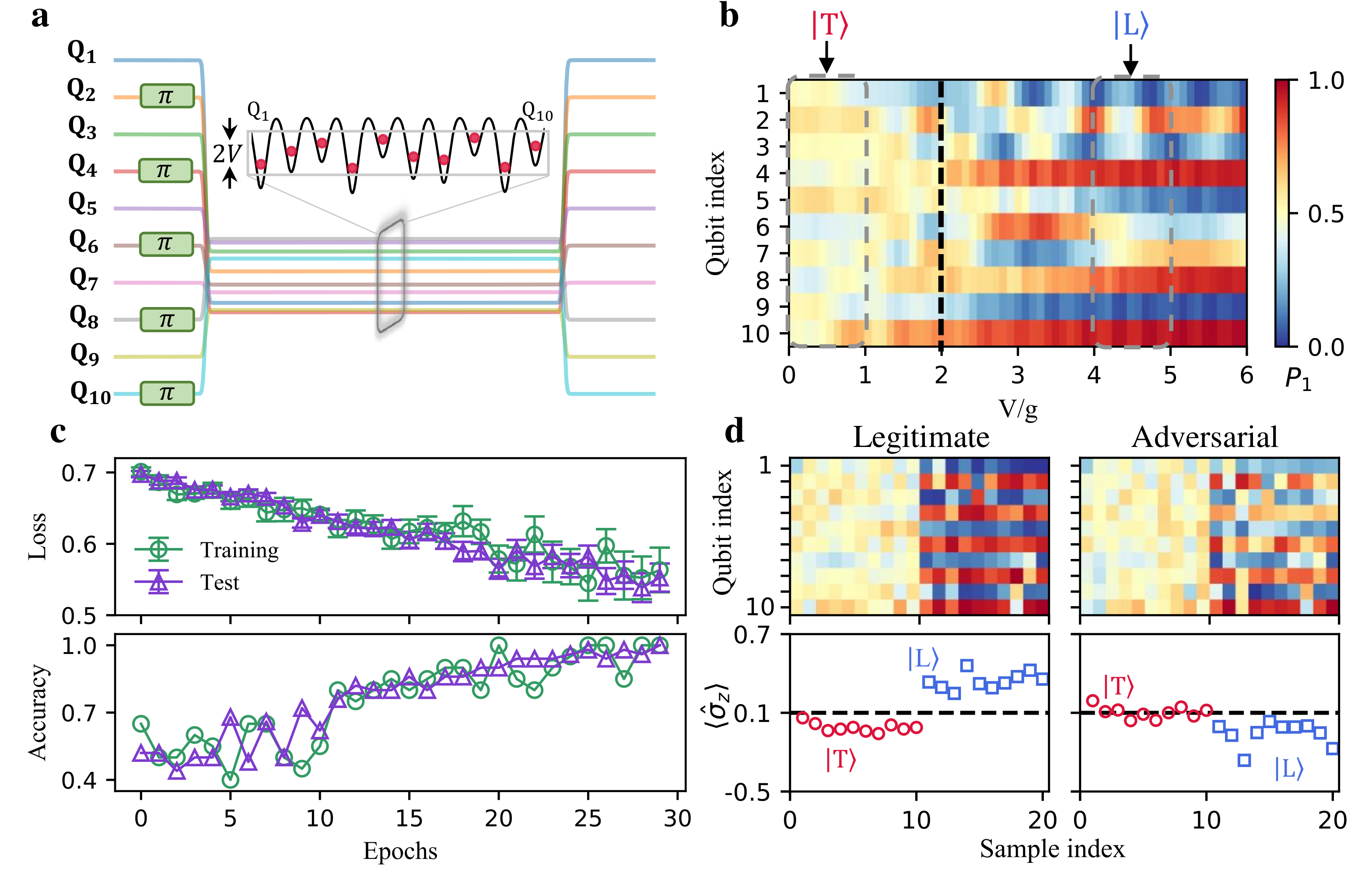 在量子机器学习领域,近年来的理论工作展示了在某些特定的任务下,量子分类模型和生成模型相对于经典模型具有可证明的、有复杂性理论保证的优势。最近两年,量子对抗机器学习的概念也被提出并受到了广泛关注。然而,在当前中等规模带噪声(NISQ)量子设备上演示量子学习模型面对对抗攻击的脆弱性和防御手段还面临诸多挑战。该研究中,kaiyun开云官方网站交叉信息研究院邓东灵团队设计了处理经典数据和量子多体态数据的学习模型,并与浙江大学超导量子计算团队合作,首次在量子设备上成功实现了高维数据的学习、对抗攻击脆弱性的揭示以及相应防御手段的展示。