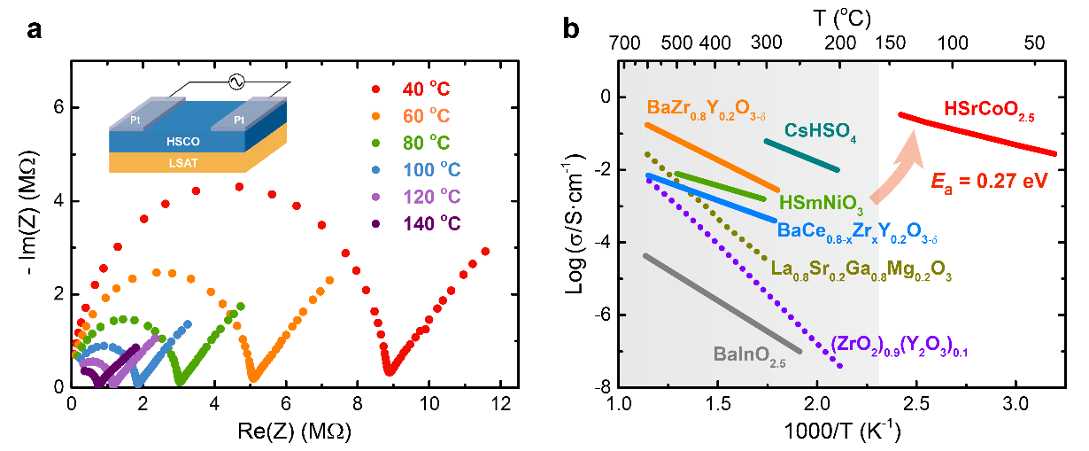该研究近日以“氢嵌入褐铁石氧化物中的显著增强低温质子电导特性”(Enhanced low-temperature proton conductivity in hydrogen-intercalated brownmillerite oxide)为题在《自然·能源》(Nature Energy)发表。《自然能源》同期刊发了题为“低温的(绝妙的)质子导体(Cool proton conductors)”的新闻与观点(News & Views)文章推荐该研究。