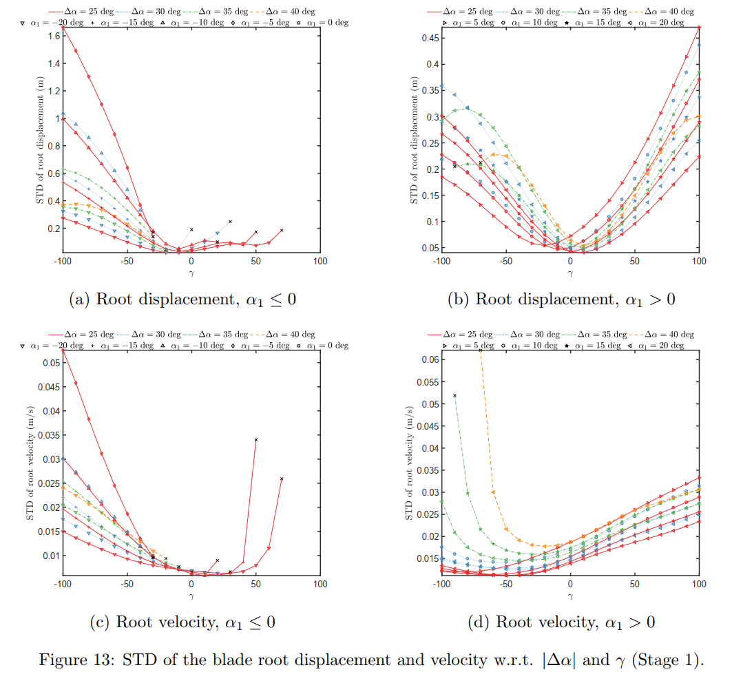 图4.水平缆绳的垂向倾角对轮毂-叶根相对运动标准差(STD)的影响