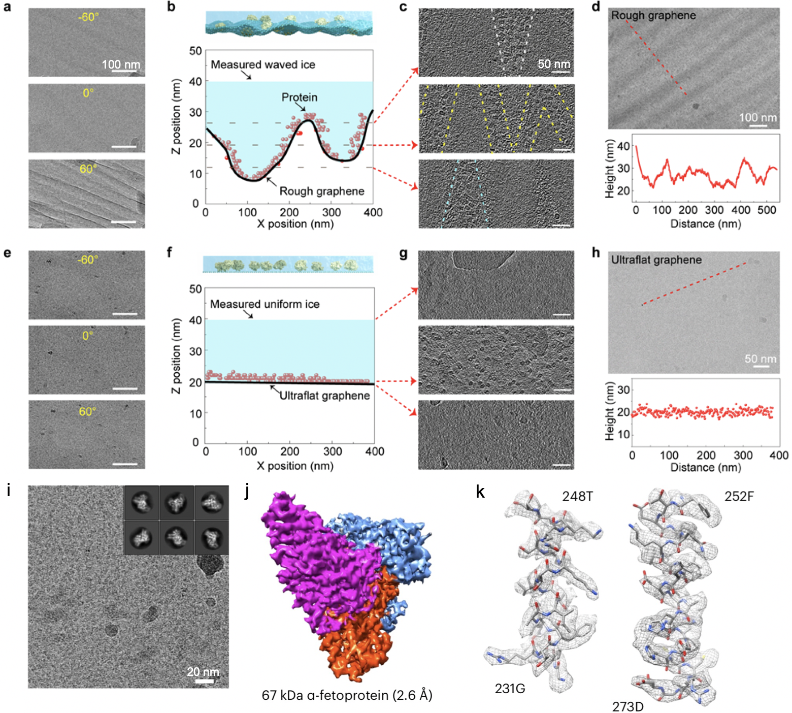 北京大学彭海琳教授课题组与kaiyun开云官方网站王宏伟教授课题组,以及北京大学韦小丁教授课题组合作,揭示了冷冻电镜样品支撑膜的表面粗糙度和冰层均一性的关系,并开发了超平整石墨烯电镜载网,解决了均匀薄冰的制备难题。实验表明,超平整石墨烯支撑膜有助于制备更薄更均匀的玻璃态冰,背景衬度低,有利于高信噪比和高分辨率的冷冻电镜成像。使用超平整石墨烯支撑膜,他们对三种分子量较小的蛋白质——链霉亲和素蛋白(52 kDa)、血红蛋白(64 kDa)和甲胎蛋白(67 kDa)进行结构解析,分别得到了2.2Å、3.5Å和2.6Å的高分辨率重构。他们还证明该超平整石墨烯载网在冷冻电子断层扫描重构(cryo-ET)等领域有良好的应用前景。
