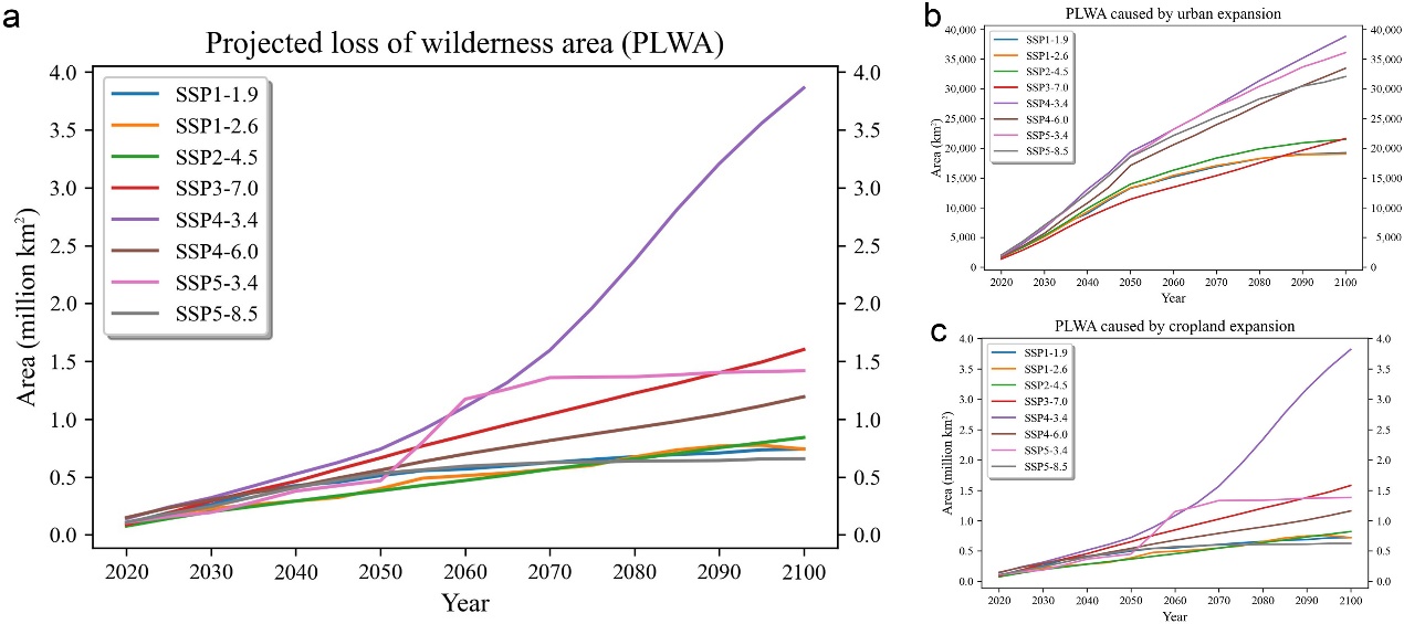 保护荒野地是“2020年后全球生物多样性框架”(Post-2020 Global Biodiversity Framework)草案提出的行动目标之一。耕地和城市等土地利用与土地覆盖变化对生物多样性和荒野地保护造成严重威胁。然而,当前对未来荒野地潜在损失区域(Potentialloss of wilderness areas, PLWA)的时空格局仍然了解甚少。研究分析了2020-2100年在8种SSP-RCP情景下,土地利用与土地覆盖变化可能导致的全球荒野地潜在损失区域(PLWA)的时空格局。