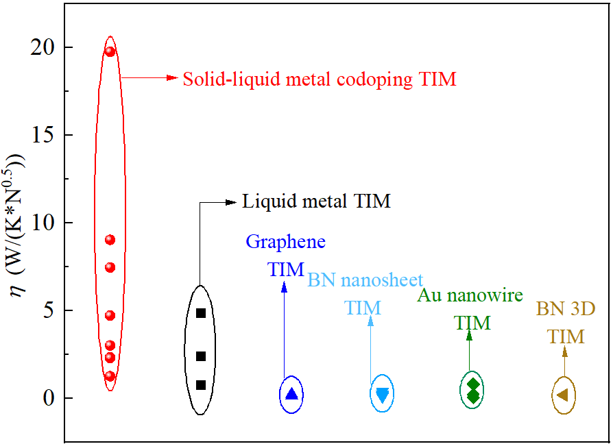不同种类热界面材料的热导率和杨氏模量差别很大,仅使用单一参数难以比较不同热界面材料的热学和力学综合性能。为此,参考介电固体的热导率与杨氏模量之间的近似关系,提出了描述热界面材料性能的热力综合性能系数η=k/E1/2(k为热导率,E为杨氏模量),综合性能系数η越大,热界面材料的热学和力学综合性能越好。图4所示不同热界面材料的热力综合性能系数,与纯液态金属掺杂的热界面材料和纯固体填料掺杂的热界面材料相比,固体颗粒和液态金属协同掺杂的热界面材料具有最佳的综合性能。固体颗粒和液态金属填料的协同效应为解决热界面材料的力学和热性能的权衡问题提供了广阔的空间。