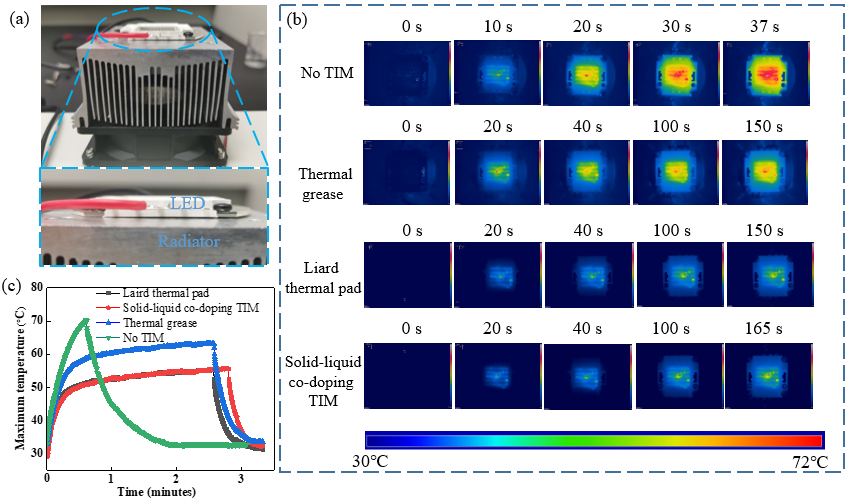 制备的热界面材料经过200次的35°C-55°C高低温循环测试,其热导率和杨氏模量基本保持不变,具有很好的应用可靠性。针对大界面间隙应用场景,以50W LED作为热源,风冷翅片散热器作为冷源,比较了协同掺杂热界面材料和导热硅脂、导热垫等商用热界面材料的导热性能,测试表明协同掺杂热界面材料的导热性能远好于导热硅脂,和导热垫的导热性能相当。与两种商用热界面材料相比,协同掺杂热界面材料具有可重复使用的优势。