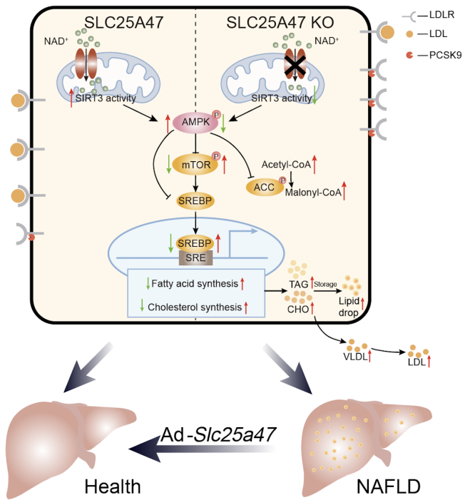 相关研究成果近期以“肝脏线粒体NAD+转运蛋白SLC25A47激活AMPKα介导脂质代谢和肿瘤形成(Hepatic mitochondrial NAD+ transporter SLC25A47 activates AMPKα mediating lipid metabolism and tumorigenesis)”为题在《肝脏学》(Hepatology)杂志上在线发表。