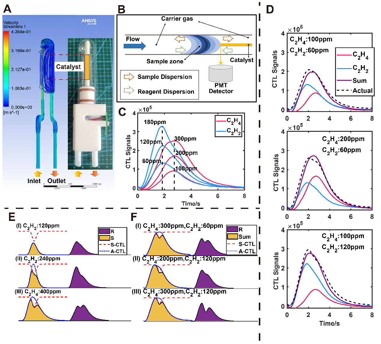 团队以单个催化化学发光传感器对乙烯-乙炔二元气体的检测为例,提出基于GRU(Gated Recurrent Unit)神经网络的混合物多组分智能检测方法。该方法通过循环迭代的方式,能够提取气体传感器的信号时序特征。该研究中,针对18种不同浓度配比的乙烯-乙炔二元气体混合物,可直接根据传感器响应信号预测各组样品的组分含量,在5折交叉验证测试中,成功识别了这18种二元气体样本,准确率达99.9%以上。