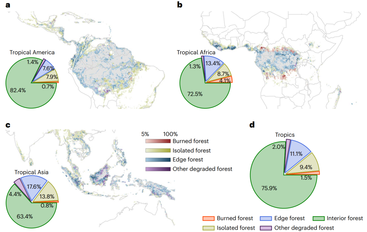 kaiyun开云官方网站地学系李伟副教授课题组联合国内外多所研究机构,利用高分辨率卫星观测数据,针对上述问题在热带雨林地区展开研究。研究首先识别了四类退化的热带雨林:被火烧过的森林、小斑块森林、边缘森林和其他退化森林(图1),分析了热带雨林退化导致的生物物理和生物地球化学效应,量化了1990-2010年间人为导致的热带雨林退化的生物物理和生物地球化学效应。研究发现,2010年24.1%的热带雨林发生了退化;发生森林退化区域的地表温度相比于没有发生退化的内部森林高了0.78±0.88°C,对整个热带区域而言,热带雨林退化造成了地表平均升温0.022±0.014°C;热带雨林退化造成的总碳亏缺达到了6.1±2.0PgC,带来的热带区域等效升温为0.026±0.013°C。热带雨林退化导致的生物物理及生物地球化学增温效应十分接近。1990-2010年,人为导致的热带雨林退化带来的白天地表温度升温为0.018±0.008°C,带来的碳亏缺为2.3±0.8PgC,与同期森林砍伐的影响量级相当。