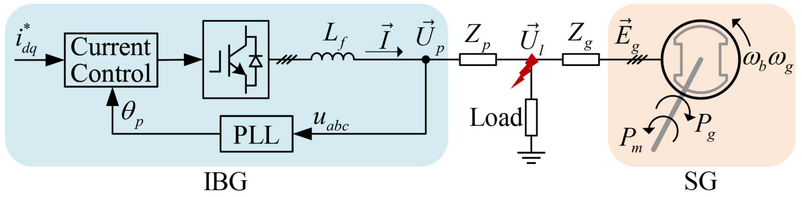 随着新能源发电技术的快速发展,大量以电力电子变流器为接口的新能源发电装备替代传统同步发电机(SG)接入电力系统。这类电力电子发电设备(IBG)在电网故障下容易发生暂态失稳现象,导致该发电设备从电网切除,这将严重危害电力系统的稳定运行。同时,与传统同步发电机的大惯量特性不同,这些电力电子发电装备具有较低的惯量,此类设备的大量接入将会导致电力系统惯量降低,由此引发电力系统频率波动加剧。现有关于电力电子发电装备的暂态稳定研究均假设电网频率恒定(50/60Hz)。然而,未来低惯量电力系统中电网频率的变化使得电力系统的暂态稳定问题更加复杂,其暂态失稳机理未知。