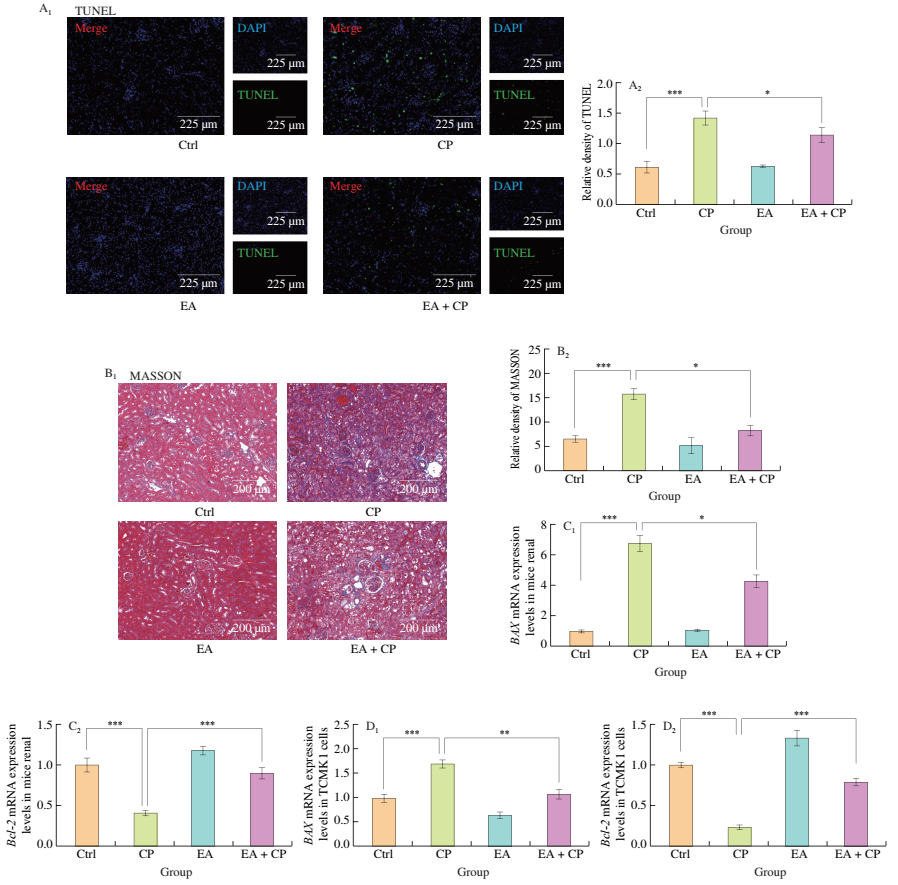 图2.鞣花酸缓解顺铂所致小鼠肾脏纤维化和肾细胞凋亡