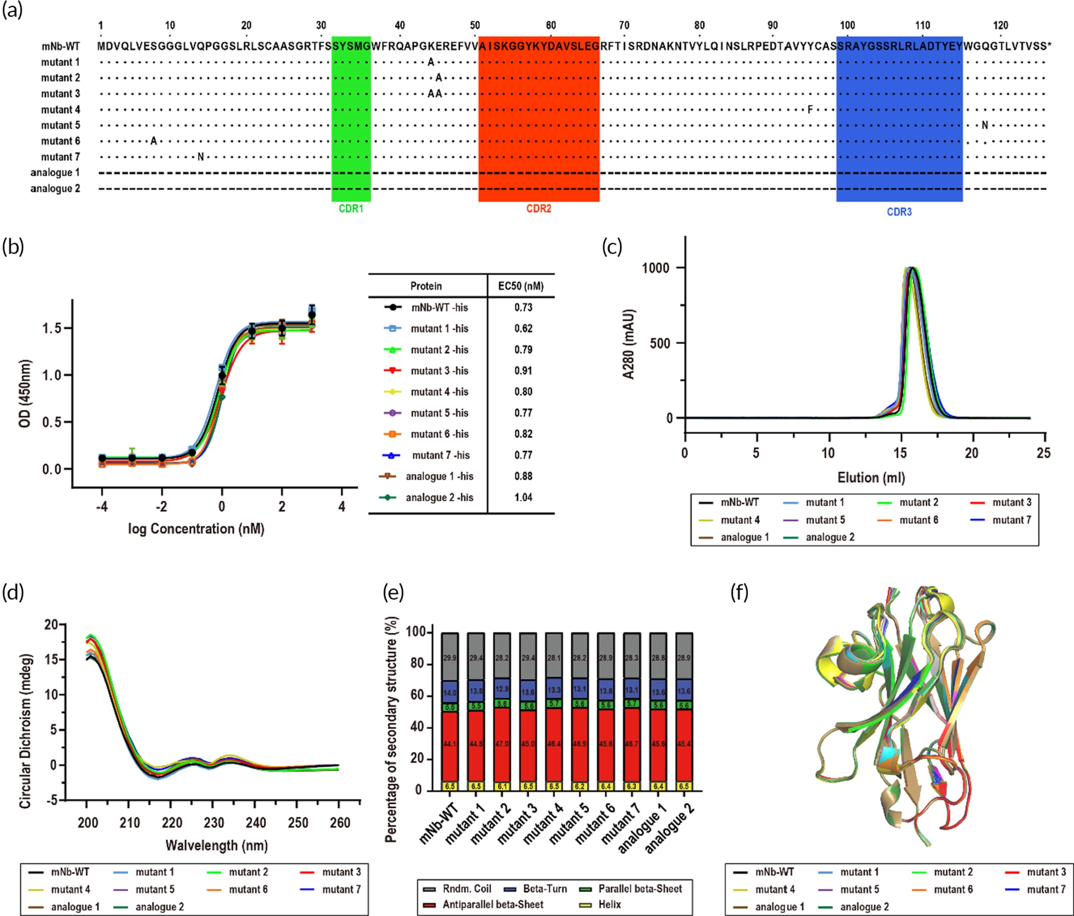 该研究以纳米抗体mNb-WT为模型蛋白药物,根据降低蛋白表面构象熵、减弱原有优势晶体不对称单元内部及不对称单元之间相互作用力,和引入纳米抗体类似物的策略,对mNb-WT位于表面的非功能性氨基酸进行改造(图1a),并通过与VEGF的结合能力(图1b)、溶液中的聚集状态(图1c)、蛋白特征性二级结构比例(图1d,e)和AlphaFold预测的三维结构(图1f)几个层面,证明突变前后的纳米抗体具有相似的特征,在药学应用中彼此具有可替代性。