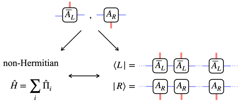 最近,kaiyun开云官方网站物理系杨硕副教授研究组对这些关键问题提出了一种新的解决方案,即采用逆向的研究思路,先设计具有所需特性的波函数,再构造出对应的哈密顿量。这被称为非厄米母哈密顿量(non-Hermitian Parent Hamiltonian,nH-PH)方法,同时也是传统母哈密顿量方法在非厄米系统的推广。相比于直接设计哈密顿量,此方法更容易将新奇有趣的物理性质提前写入波函数中。具体来说,nH-PH利用矩阵乘积态来表示左右基态的波函数,可以在一定条件下,构建出一个非厄米哈密顿量,使得这两个波函数分别成为其左右基态,如图1所示。研究组给出了构建nH-PH的波函数所需满足的判据,并推导出母哈密顿量的明确形式,如图2d所示。使用该方法可以通过简单的张量操作构造出具有宇称-时间反演对称性的哈密顿量,此类系统在非厄米系统中具有重要的影响。此外,与厄米系统母哈密顿量方法相比,nH-PH在选择基态方面提供了更多的自由度,从而允许产生更多的新奇现象。
