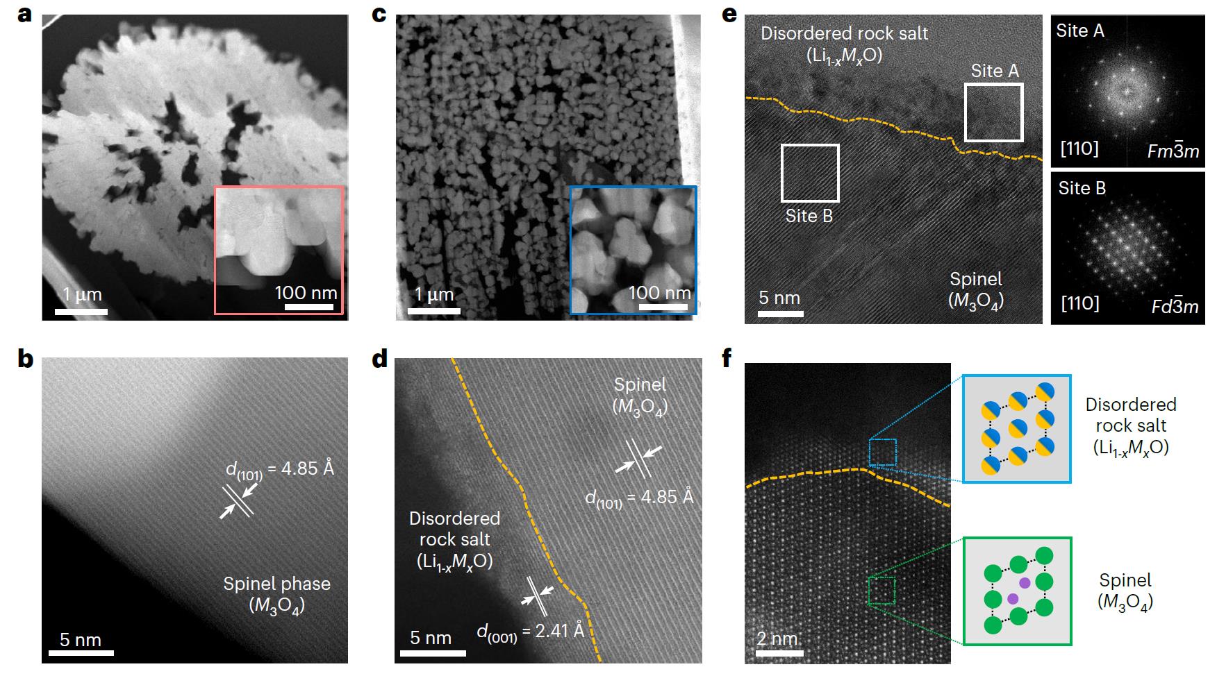 文章提出的行星式离心解团工艺能够将具有球形二次颗粒形貌的过渡金属氧化物前驱体,在与LiOH-LiNO3共晶锂盐混合的过程中,分离成均匀分布在锂盐基体中的一次纳米颗粒。在混合过程中,体系的宏观和微观形貌均发生了显著的变化(图1)。同时,共晶锂盐发生液化,对氧化物前驱体进行晶界腐蚀,通过反应浸润分离开氧化物前驱体的一次颗粒。这一纳米尺寸下的机械化学反应机理也在原子尺度上得到了证实(图2)。该共晶锂盐在正极高温锂化过程中被充分利用,最终获得高电化学活性的微米级富锂锰基单晶正极(图3)。这一方法也在高镍三元正极中都得到了成功的验证。