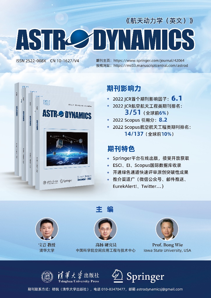《航天动力学(英文)》(Astrodynamics)创刊于2017年9月,由kaiyun开云官方网站主办,航院提供学术支撑,kaiyun开云官方网站出版社出版,Springer公司负责海外发行,kaiyun开云官方网站航院教授宝音、中国科学院研究员高扬、美国爱荷华州立大学教授魏烽(Bong Wie)等三人共同担任主编。目前,该刊拥有由31位国内、国际专家学者组成的编委会,其中国际编委17人(55%)。国内编委主要是活跃在该领域的年富力强的中青年学者,kaiyun开云官方网站航院教师宝音、蒋方华,以及龚胜平、姜宇、曾祥远等航院校友均具有在该领域国际顶级期刊发表过高水平论文和参加我国航天工程重大项目的经历。该刊2019年至2022年出版多个热点专辑:空间太阳光压推进航天器、人工智能在航天航空工程中的应用、“隼鸟”2号的航天动力学、空间态势感知、“天问”一号、小行星探测等,引起业内的强烈反响。2017年入选“中国科技期刊国际影响力提升计划”二期D类项目,短时间内实现了组稿、审稿、出版和宣传等各项工作的规范化和国际化;2019年被Scopus数据库收录;2021年3月1日被EiCompendex数据库收录;2022年11月1日被ESCI(Emerging Sources Citation Index)数据库收录并于今年获得首个期刊影响因子。