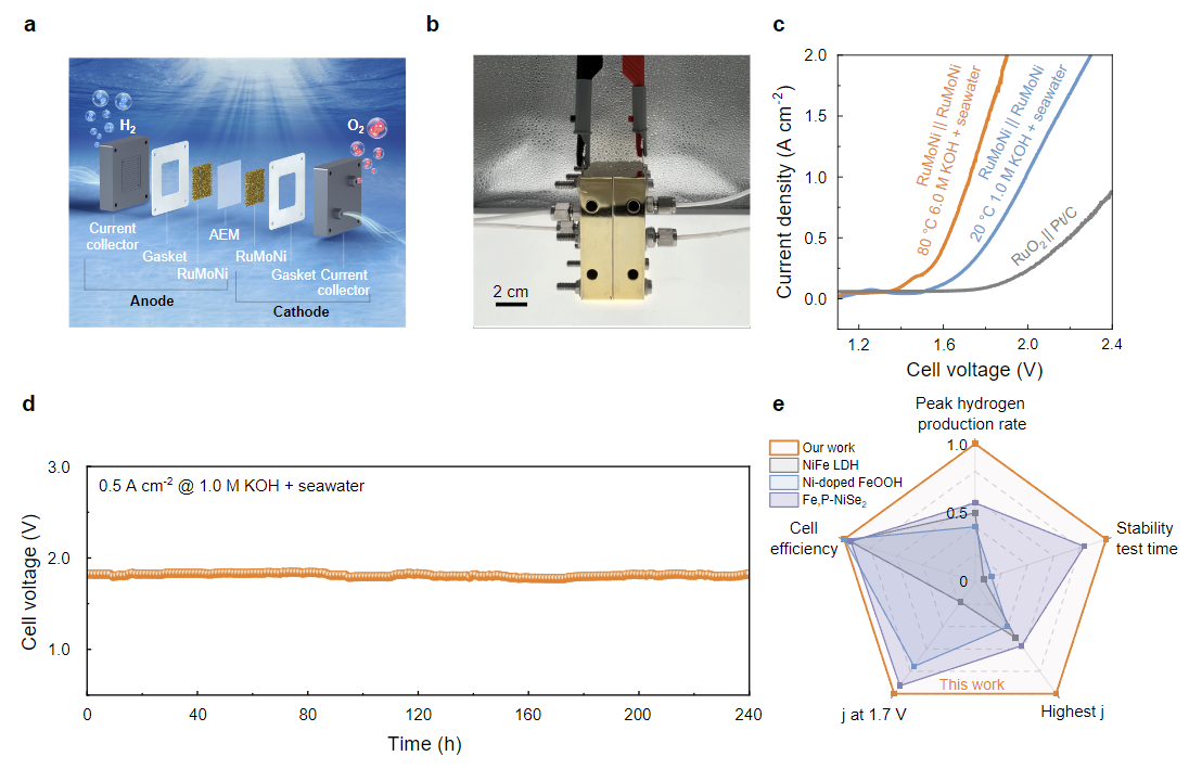 研究人员以RuMoNi作为双功能电极,组装了碱性海水阴离子交换膜(AEM)电解槽。该电解槽仅需1.72 V的电压就可实现1 A/cm2的电流密度制氢,且在0.5A/cm2的电流密度下,实现了连续240小时的稳定的海水电解。该AEM电解槽表现出高活性、高H2产率、高稳定性,与已报道的AEM海水电解槽相比具有显著优势。