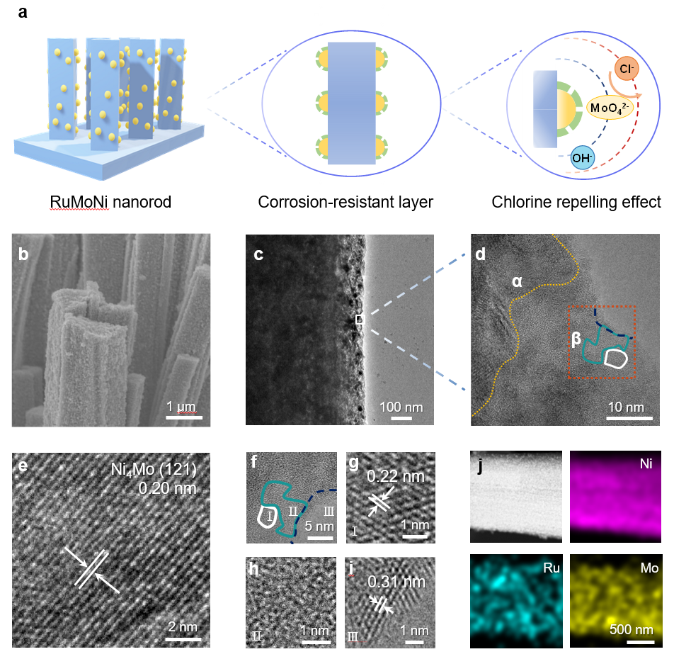 近日,kaiyun开云官方网站深圳国际研究生院刘碧录教授团队开发了一种高性能、耐腐蚀海水电解催化剂。研究人员通过水热法和电化学活化法制备了钌钼镍(RuMoNi)催化剂,这种催化剂由表面多孔纳米棒阵列组成。高分辨透射电镜表明该催化剂由镍钼合金(Ni4Mo)导电基底、氧化钌/羟基氧化镍(RuO2/NiOOH)活性相和钼酸镍(NiMoO4)抗腐蚀层构成。