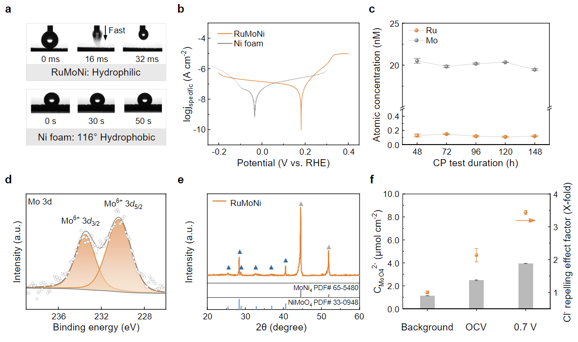 研究人员对RuMoNi电催化剂稳定性和选择性机理进行了深入探究。通过接触角的测定发现RuMoNi具有超亲水特性,因此催化剂的气泡黏附力低。Tafel图显示RuMoNi催化剂的腐蚀电位高于Ni foam,耐腐蚀性能更好。实验发现在电流密度为500 mA/cm2时间为150 小时的稳定性测试过程中,电解液中Ru和Mo的含量无显著变化,说明RuMoNi催化剂在大电流密度下优异的耐腐蚀性。不同电位下电极表面溶液的元素测试结果说明电极表面吸附的钼酸根(MoO42-)浓度随电位的升高而升高,吸附的MoO42-通过静电相互作用排斥Cl-,从而抑制Cl-对电极的腐蚀。