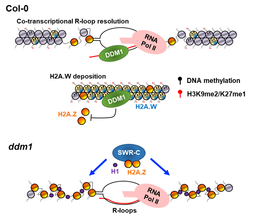 综上所述,本项研究揭示了拟南芥的一种染色质重塑蛋白DDM1的主要功能是排斥异染色质区域的H2A.Z积累并解除R-loop,从而启动异染色质的形成,阐明DDM1维持基因组DNA甲基化的分子新机制和生物学新功能(图7)。